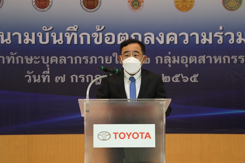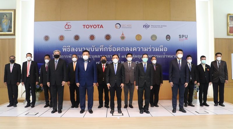 นายสมคิด ประดิษฐ์กำจรชัย รองกรรมการผู้จัดการใหญ่ บริษัท โตโยต้า มอเตอร์ ประเทศไทย จำกัด พร้อมด้วย นายสมชาย จักร์กรีนทร์ ผู้อำนวยการสถาบันไทย – เยอรมัน (Thai-German Institute) และ ดร.อภิชาติ ทองอยู่ ประธานคณะทำงานประสานงานด้านการพัฒนาบุคลากรในเขตพัฒนาพิเศษภาคตะวันออก (Eastern Economic Corridor Human Development Center) ร่วมลงนามบันทึกความร่วมมือระหว่าง บริษัท โตโยต้า มอเตอร์ ประเทศไทย จำกัด สถาบันไทย – เยอรมัน มหาวิทยาลัย และวิทยาลัยเทคนิคชั้นนำ 10 แห่ง ในเขตพัฒนาพิเศษภาคตะวันออก ในการดำเนินโครงการ “การพัฒนาทักษะบุคลากรภายใต้ 12 กลุ่มอุตสาหกรรมเป้าหมาย” เพื่อถ่ายทอดองค์ความรู้ในด้านเทคโนโลยี ยานยนต์ การผลิต และการบริหารจัดการเพื่อเพิ่มประสิทธิภาพการผลิตของโตโยต้า ตลอดจนร่วมศึกษาความเป็นไปได้ในการพัฒนาหลักสูตรองค์ความรู้และทักษะที่จำเป็นอื่นๆ แก่บุคลากรเพื่อเตรียมความพร้อมให้ตรงกับความต้องการของ 12 กลุ่มอุตสาหกรรมเป้าหมาย เมื่อวันพฤหัสบดีที่ 7 กรกฏาคม ที่ผ่านมา ณ ห้องประชุมออดิทอเรียม อาคารพนาเวศ โรงงานโตโยต้าบ้านโพธิ์ จังหวัดฉะเชิงเทรา