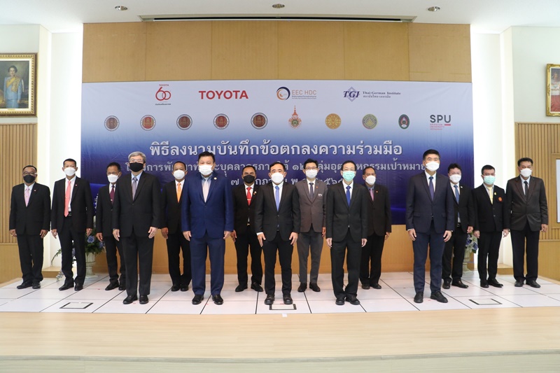 นายสมคิด ประดิษฐ์กำจรชัย รองกรรมการผู้จัดการใหญ่ บริษัท โตโยต้า มอเตอร์ ประเทศไทย จำกัด พร้อมด้วย นายสมชาย จักร์กรีนทร์ ผู้อำนวยการสถาบันไทย – เยอรมัน (Thai-German Institute) และ ดร.อภิชาติ ทองอยู่ ประธานคณะทำงานประสานงานด้านการพัฒนาบุคลากรในเขตพัฒนาพิเศษภาคตะวันออก (Eastern Economic Corridor Human Development Center) ร่วมลงนามบันทึกความร่วมมือระหว่าง บริษัท โตโยต้า มอเตอร์ ประเทศไทย จำกัด สถาบันไทย – เยอรมัน มหาวิทยาลัย และวิทยาลัยเทคนิคชั้นนำ 10 แห่ง ในเขตพัฒนาพิเศษภาคตะวันออก ในการดำเนินโครงการ “การพัฒนาทักษะบุคลากรภายใต้ 12 กลุ่มอุตสาหกรรมเป้าหมาย” เพื่อถ่ายทอดองค์ความรู้ในด้านเทคโนโลยี ยานยนต์ การผลิต และการบริหารจัดการเพื่อเพิ่มประสิทธิภาพการผลิตของโตโยต้า ตลอดจนร่วมศึกษาความเป็นไปได้ในการพัฒนาหลักสูตรองค์ความรู้และทักษะที่จำเป็นอื่นๆ แก่บุคลากรเพื่อเตรียมความพร้อมให้ตรงกับความต้องการของ 12 กลุ่มอุตสาหกรรมเป้าหมาย เมื่อวันพฤหัสบดีที่ 7 กรกฏาคม ที่ผ่านมา ณ ห้องประชุมออดิทอเรียม อาคารพนาเวศ โรงงานโตโยต้าบ้านโพธิ์ จังหวัดฉะเชิงเทรา