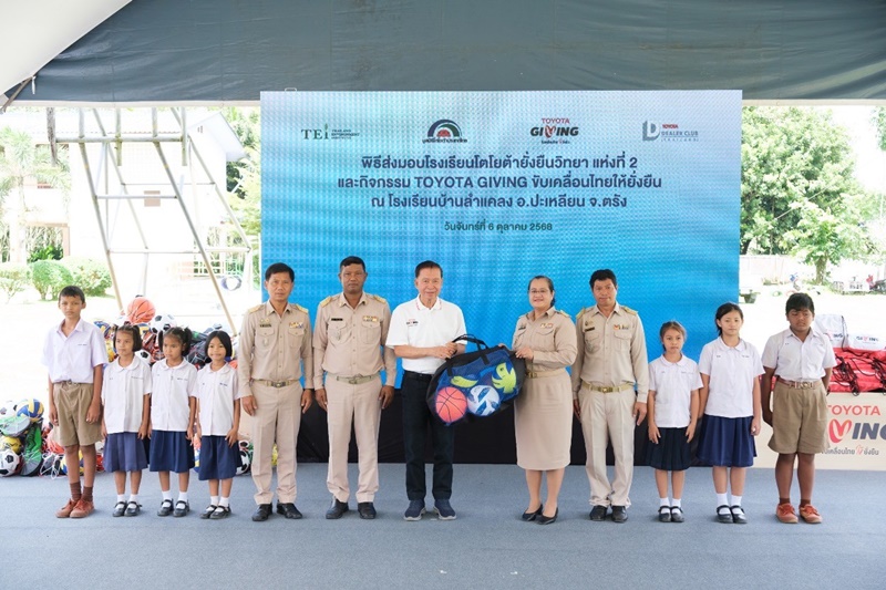 นายประมนต์ สุธีวงศ์ ประธานมูลนิธิโตโยต้าประเทศไทย พร้อมด้วย นายทรงกลด สว่างวงศ์ ผู้ว่าราชการจังหวัดตรัง ดร. ชุลีกร ทองด้วง ผู้อำนวยการสำนักงานเขตพื้นที่การศึกษาประถมศึกษาตรัง เขต 1 นางสาววิศรา หุ่นธานี ผู้อำนวยการฝ่ายมลพิษ พลังงาน และสิ่งแวดล้อม สถาบันสิ่งแวดล้อมไทย คณะกรรมการมูลนิธิโตโยต้าประเทศไทย คณะผู้บริหารบริษัท โตโยต้า มอเตอร์ ประเทศไทย จำกัด คณะผู้บริหารชมรมผู้แทนจำหน่ายโตโยต้า ร่วมเป็นเกียรติ ในพิธีส่งมอบโรงเรียนยั่งยืนวิทยา แห่งที่ 2 พร้อมมอบอุปกรณ์การเรียน และอุปกรณ์กีฬา ให้แก่นักเรียนในเครือข่าย กลุ่มโรงเรียนปะเหลียน เมื่อวันจันทร์ที่ 6 ตุลาคม พ.ศ.2568 ณ โรงเรียนบ้านลำแคลง จังหวัดตรัง