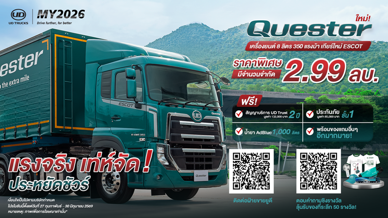 - UD Trucks เปิดตัว Quester รุ่นใหม่ MY2026 เครื่องยนต์ 8 ลิตร จัดเต็มพร้อมเกียร์ ESCOT และโปรโมชั่นสุดคุ้ม