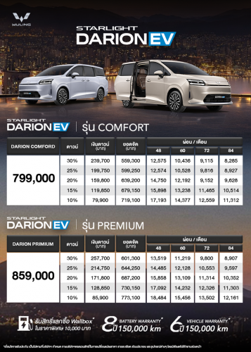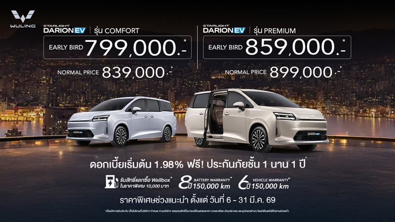สำหรับลูกค้าที่กำลังพิจารณารถยนต์ไฟฟ้าแบบ MPV-VAN ประตูสไลด์ไฟฟ้า หรือ Family Car นี่คือช่วงเวลาที่ดีที่สุดในการตัดสินใจ WULING THAILAND มอบแคมเปญสุดเอ็กซ์คลูซีฟฉลองการเปิดตัวบริษัทอย่างเป็นทางการ พร้อมประกาศราคาช็อกตลาดสำหรับ WULING STARLIGHT DARION EV เริ่มต้น 799,000 บาท
